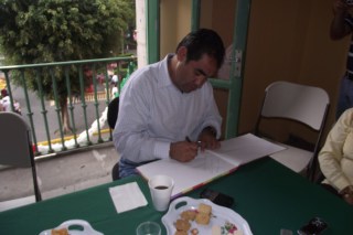 Rolando Ortega Salazar, firmando el libro de visitantes distinguidos, después de la charla sostenida con integrantes de LEX en el 107 del edificio Nachita en pleno corazón de la capital de Veracruz.