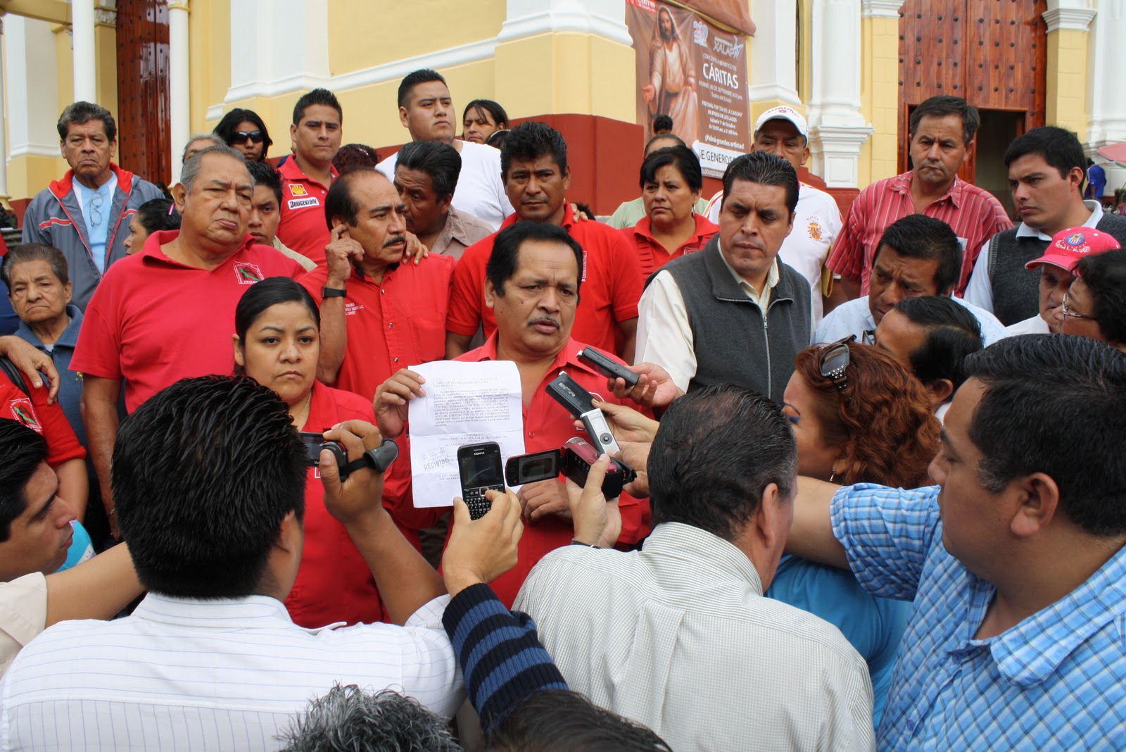 Ante representantes de los diversos medios de comunicación de la entidad veracruzana, Miguel Ángel Aguilar Garduño exhibe el documento que les da a él y a Claudia Yanet Díaz Lima su libertad por falta de pruebas en la acusación de supuesto fraude en contra de sus agremiados.