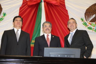 Diputados Doctor Eduardo Andrade Sánchez, Armando Méndez de la Luz y Juan Carlos Castro Pérez, presidente, vicepresidente y secretario, respectivamente, de la Mesa Directiva del Congreso de Veracruz, durante la sesión que dio inicio al Primer Periodo de Sesiones Ordinarias del Segundo Año de Ejercicio Constitucional.