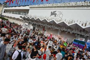 Unos 500 activistas ocuparon durante varias horas el acceso al Palacio del Cine, sede principal del certamen, a pocas horas del arranque de la ceremonia en la que esta tarde se anunciará el palmarés. “Hemos escogido este lugar para arrojar luz sobre un problema tan grave como la crisis climática. Con todas las cámaras del mundo puestas sobre Venecia, es un buen momento para transmitir este mensaje y obtener un compromiso de las instituciones e incluso de los artistas que participan en el certamen”, señalaba Chiara Buratti, portavoz del Comité No Grandi Navi, que se opone a la circulación de grandes cruceros en Venecia. Fue esta organización la que convocó la concentración en la Mostra junto con Fridays for Future, el movimiento estudiantil fundado por la activista sueca Greta Thunberg. Además, los jóvenes han convocado a las 17.00 una marcha por el clima en el Lido de Venecia, con la intención de alcanzar la alfombra roja en el inicio de la ceremonia de clausura.