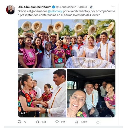 Este sábado, Sheinbaum realiza una gira por el estado de Oaxaca, donde impartirá dos conferencias magistrales sobre políticas públicas que realiza su administración.