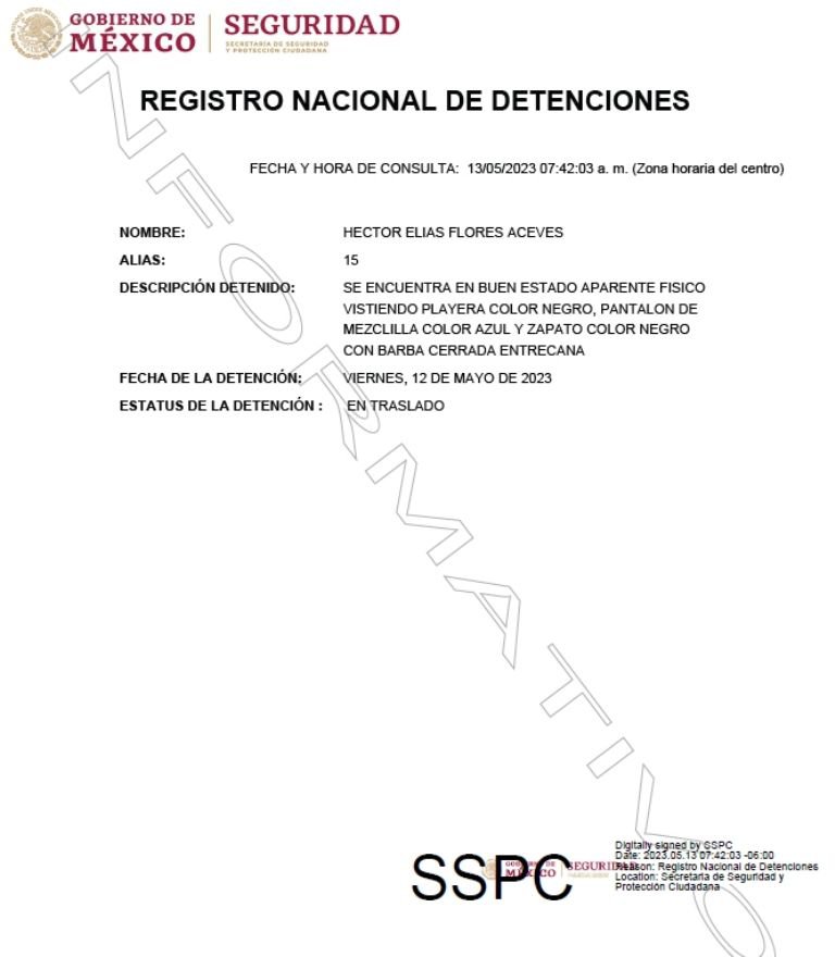 El Heraldo Digital consultó el Registro Nacional de Detenciones (RND) y en el informe se menciona que la detención ocurrió el 12 de mayo y se encuentra en traslado. Asimismo, fueron elementos de la Unidad de Operaciones Especiales (UNOPES) de la Armada de México, en coordinación con trabajos de inteligencia quienes lograron posible la aprehensión de «el 15» en Guamúchil, Sinaloa.
