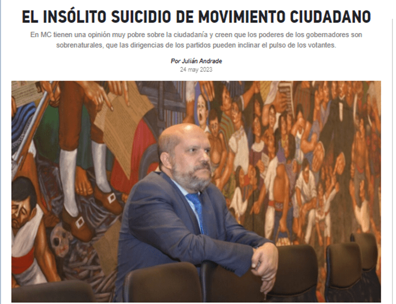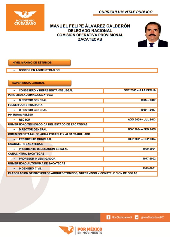 En todo caso, otro socio de Información para la Democracia también es un cuadro dirigente del partido naranja, Felipe Álvarez Calderón, que en 2021 fungía como coordinador de la Comisión Estatal Operativa de MC en Zacatecas.