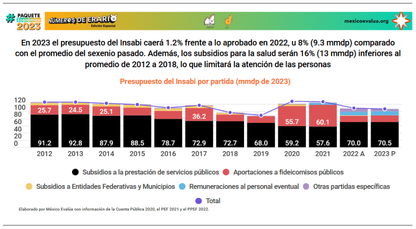 Lo más grave es el desplome de 10% (18.9 mmdp) de la SSA, en relación con lo aprobado en 2022, pues es esta institución la que alcanza a las personas más vulnerables en México. Al interior de esta dependencia, es notorio el abandono del Insabi: su presupuesto caerá 1.2% frente a lo aprobado en 2022, pero la caída es de 6.8% (7.9 mmdp) si se compara con el promedio del sexenio pasado, cuando era Seguro Popular. Además, al desagregar este gasto, notamos que los subsidios para la salud serán 14% (11.8 mmdp) inferiores al promedio de 2013 a 2018. En efecto, los recursos para la atención de las personas sin seguridad social seguirán muy limitados.
