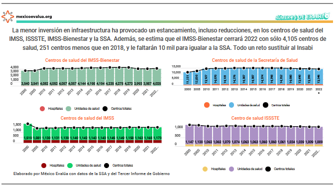 Por su parte, la Secretaría de Salud y Servicios Estatales de Salud, donde opera el Insabi, cerrarán el 2022 con 14,380 unidades, 124 centros menos que en 2021 o 728 unidades menos que en 2018. Ni la Secretaría de Salud ni los informes de Gobierno explican la razón de la disminución de estas unidades médicas. Es posible que su baja sea administrativa, es decir, que algunos centros dejen de recibir apoyos federales o incluso que por la falta de mantenimiento queden inoperantes.