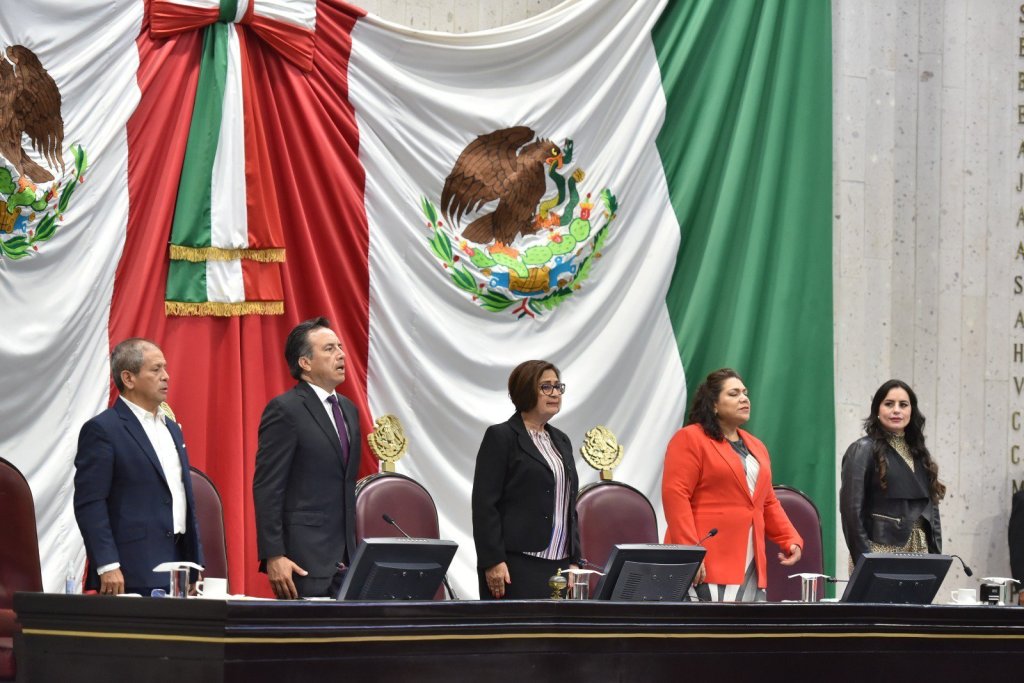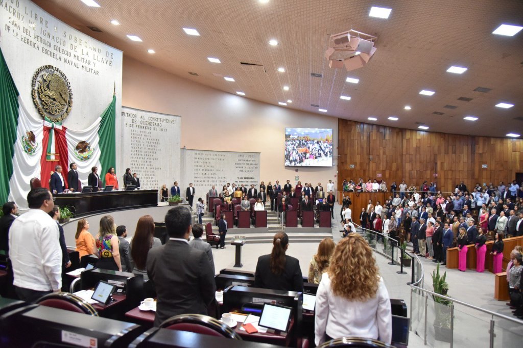 Tras la recepción del y la titular de los poderes Ejecutivo y Judicial, así como de la galardonada, por parte de las comisiones de cortesía, fue entonado el Himno Nacional mexicano y posteriormente, en el uso de la voz, la presidenta de la Mesa Directiva, diputada Margarita Corro Mendoza, dio la bienvenida a todas y todos, puntualizando que este acto invita a la reflexión para dimensionar la trascendencia de las acciones u omisiones, pasadas y presentes, de cara a las generaciones venideras.
