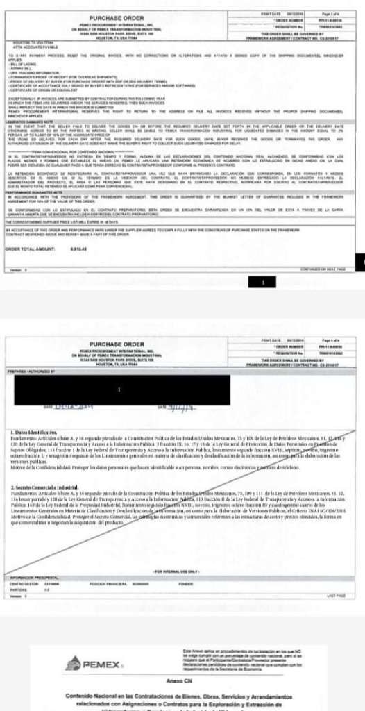 Los documentos fueron obtenidos por MCCI tras un proceso que duró 14 meses, aunque Pemex censuró las firmas, por lo que no se puede conocer quién fue el ejecutivo de Baker Hughes que suscribió los contratos.