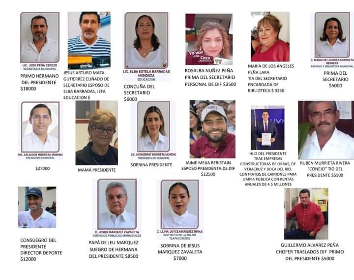 El nepotismo en Tlapacoyan, ha sido el sello por el cual, se ha venido saqueando, descaradamente a las arcas municipales. Así como también, se han venido tendiendo relaciones dudosas entre el edil, Murrieta Moreno y personalidades clave de la política estatal.