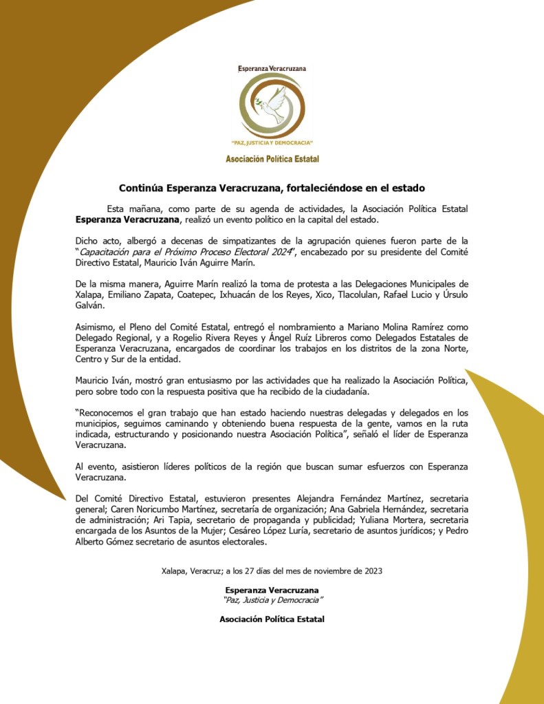 Xalapa, Veracruz; 27 de noviembre de 2023.- Esta mañana, como parte de su agenda de actividades, la Asociación Política Estatal Esperanza Veracruzana, realizó un evento político en la capital del Estado.