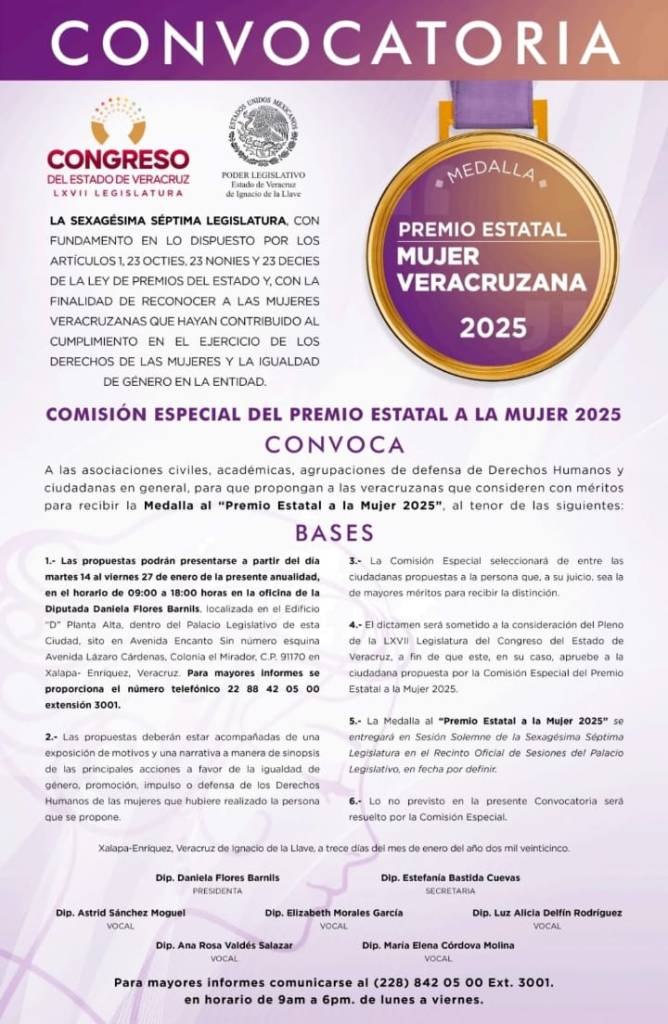 Xalapa, Ver., 15 de enero de 2025.- El Congreso del Estado de Veracruz emitió la convocatoria, fundamentada en los artículos 1, 23 octies, 23 nonies y 23 decies de la Ley de Premios del Estado, dirigida a asociaciones civiles, académicas, agrupaciones de defensa de derechos humanos y ciudadanas en general, para que propongan a veracruzanas con méritos para recibir la medalla Premio Estatal a la Mujer 2025.