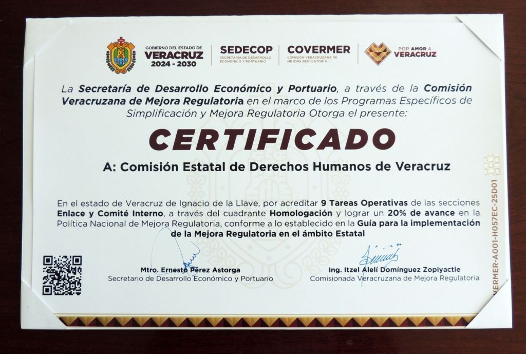 En sala de juntas de las oficinas centrales, la ombudsperson recibió el Certificado que otorga la Secretaría de Desarrollo Económico y Portuario a través de la Comisión Veracruzana de Mejora Regulatoria en el marco de Programas Específicos de Simplificación y Mejora Regulatoria; así como el Reconocimiento por el cumplimiento de Instalación del Comité Interno.