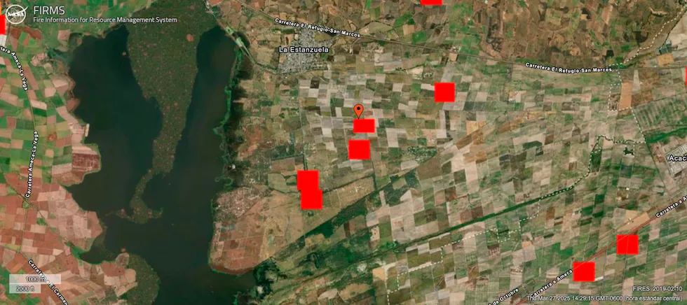 Datos de otros satélites consultados por este diario refuerzan las conclusiones del estudio. El Sistema de Información de Incendios de la NASA (FIRMS, por sus siglas en inglés) señala, por ejemplo, que en las fechas previas a la identificación del pico de ceniza hubo actividad de fuego en el área del rancho, a lo largo de 15 días, registrada por los satélites de la agencia espacial estadounidense. Según la herramienta, la detección de fuego comenzó el 26 de enero de 2019 y se mantuvo constante hasta el 9 de febrero. La investigadora Gabriela Belaunzarán, geoinformática y analista espacial, sostiene que, tomando en cuenta los indicios de cremación hallados por los colectivos buscadores y la identificación de ceniza, el fuego detectado por los satélites de la NASA a lo largo de dos semanas puede corresponderse a un incendio controlado, alimentado y sostenido intencionalmente. Las imágenes del FIRMS impiden, sin embargo, a diferencia del Sentinel-2, determinar si los fuegos ocurrieron dentro del rancho o en su entorno cercano.