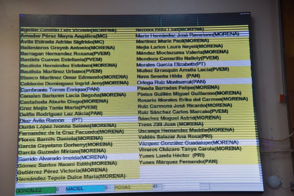 La Mesa Directiva, presidida por la diputada Tanya Carola Viveros Cházaro, instruyó la apertura del tablero electrónico de votación y concluido el lapso para ello, quedó de la siguiente manera: Stephany Rosas Méndez, 41; Guilebaldo Maciel Mercado, 0 y Sandra Luz González Mogollón, 0.