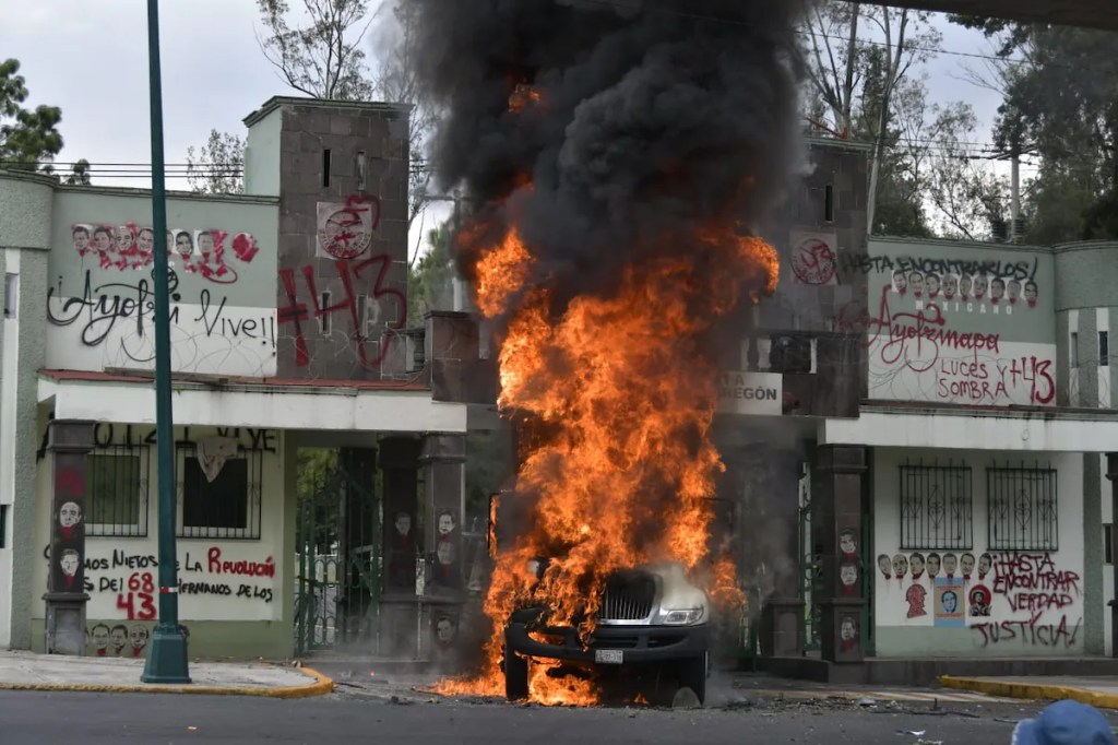 Manifestantes queman un camión ante la puerta del Campo Militar en protesta por los desaparecidos de Ayotzinapa
